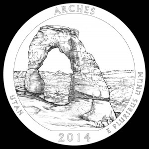Reverses of Arches National Park quarters and five ounce silver coins will depict Delicate Arch, one of the most famous sandstone arches of the park. In the distance, the La Sal Mountains appear. Reverse inscriptions include ARCHES, UTAH, 2014 and E PLURIBUS UNUM.
