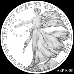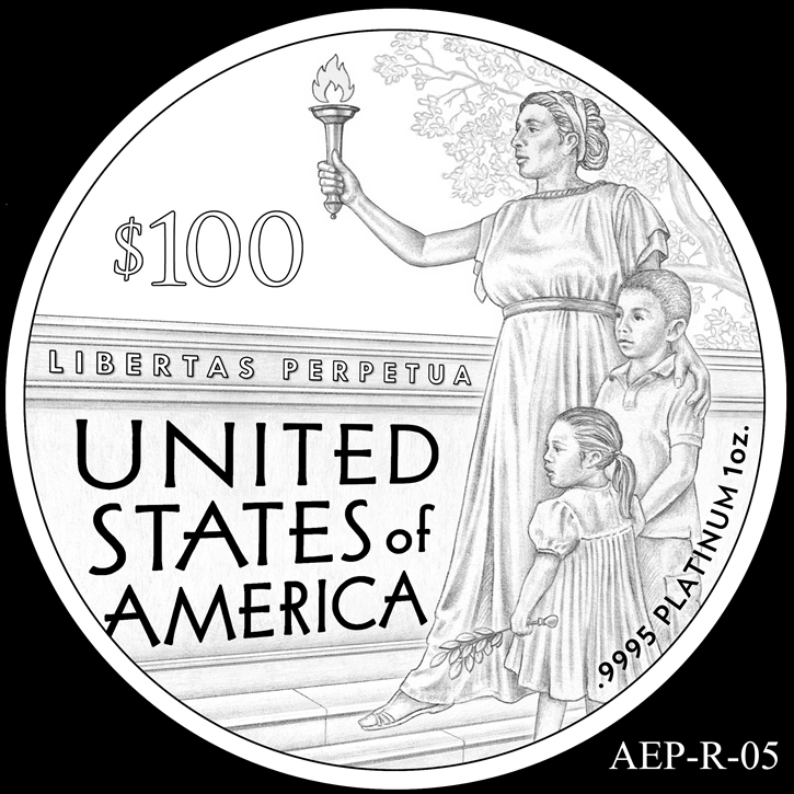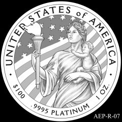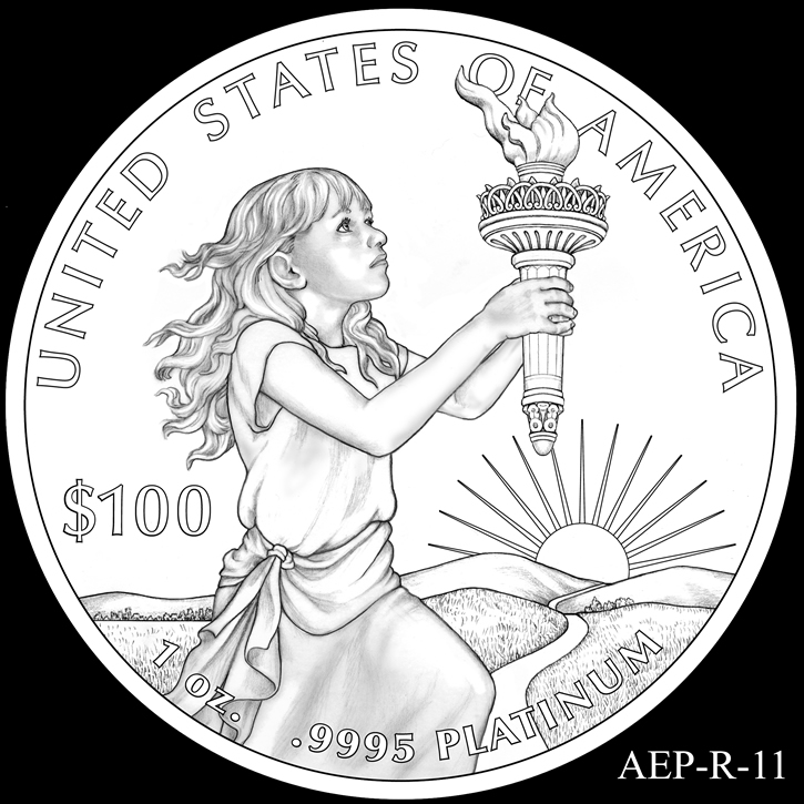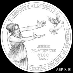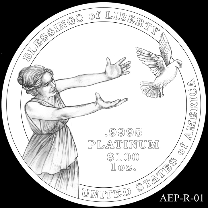Lady Liberty has been shown on the obverse of the Platinum American Eagles since their start. The image was designed and sculpted by former United States Mint Sculptor-Engraver John Mercanti.