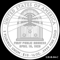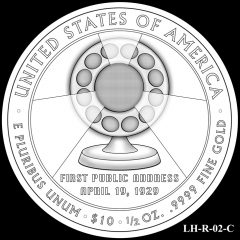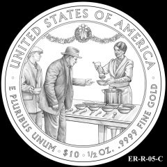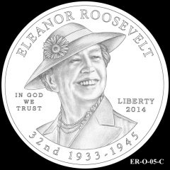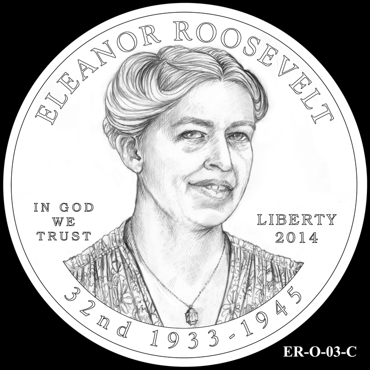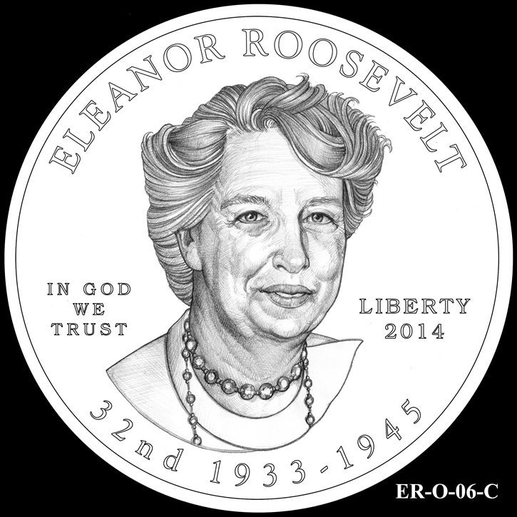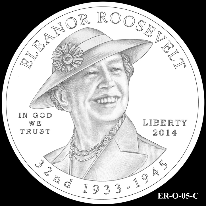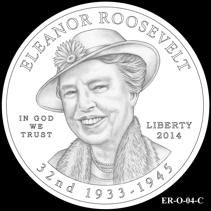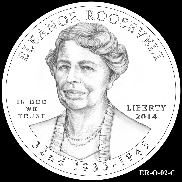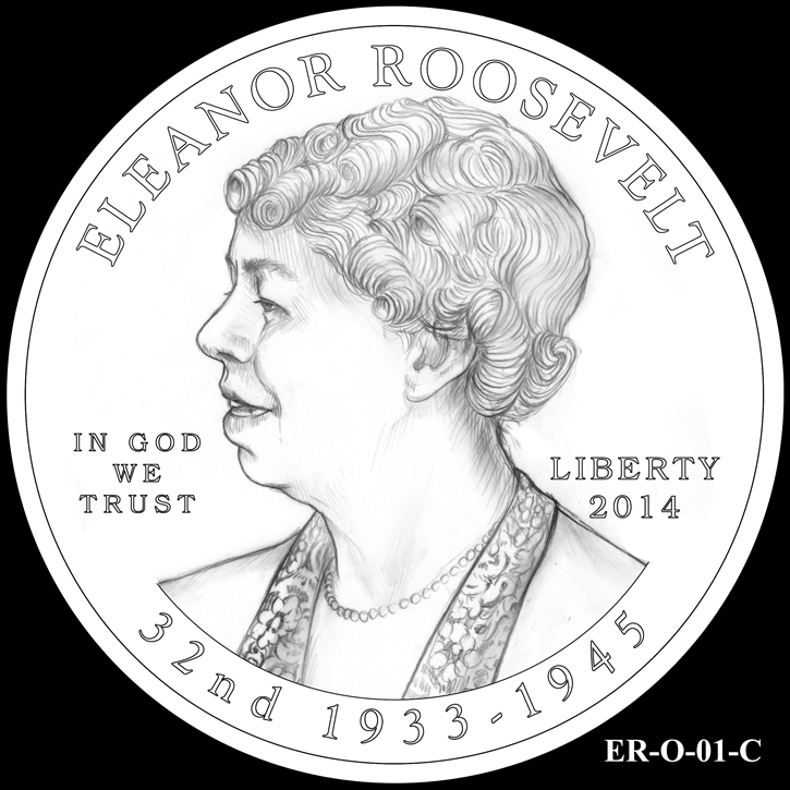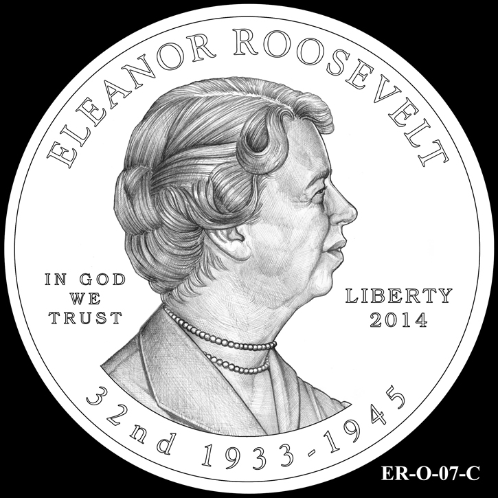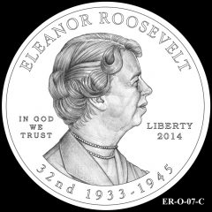 Seven obverse design candidates were unveiled for the Eleanor Roosevelt Gold Coins. Similar to the other coins of the series, the portrait will be surrounded by inscriptions to include ELEANOR ROOSEVELT, IN GOD WE TRUST, LIBERTY, 2014, 32ND and 1933-1945.