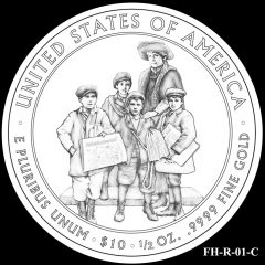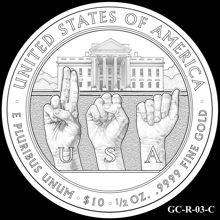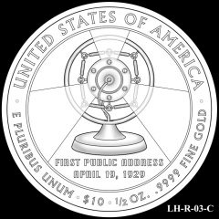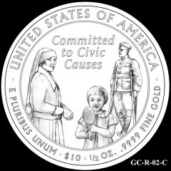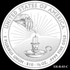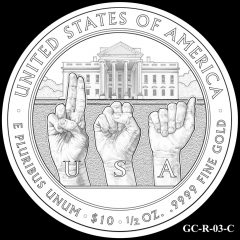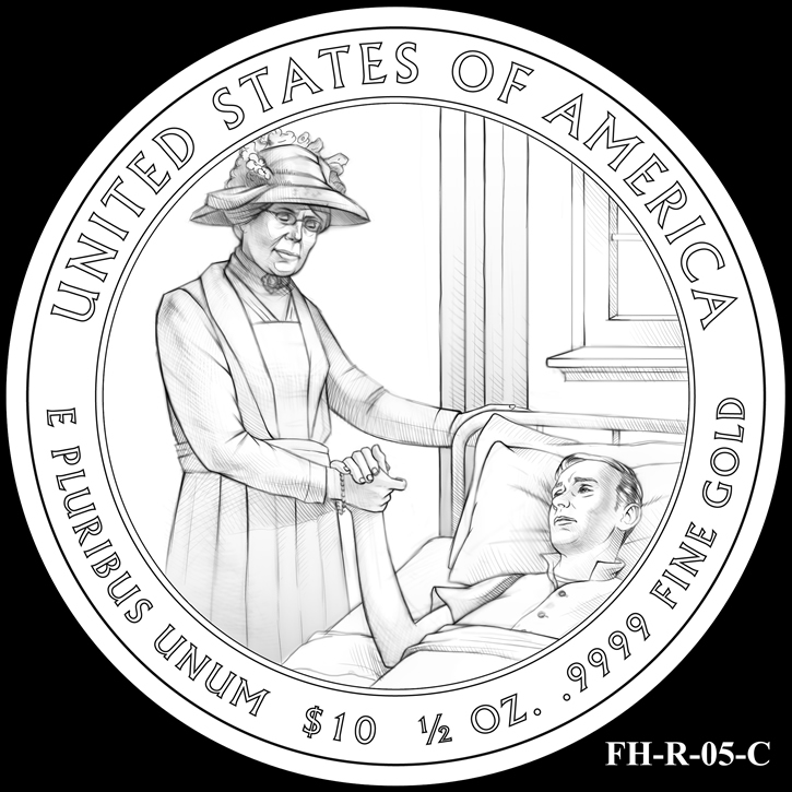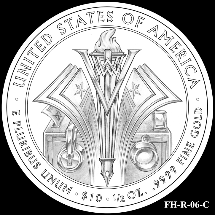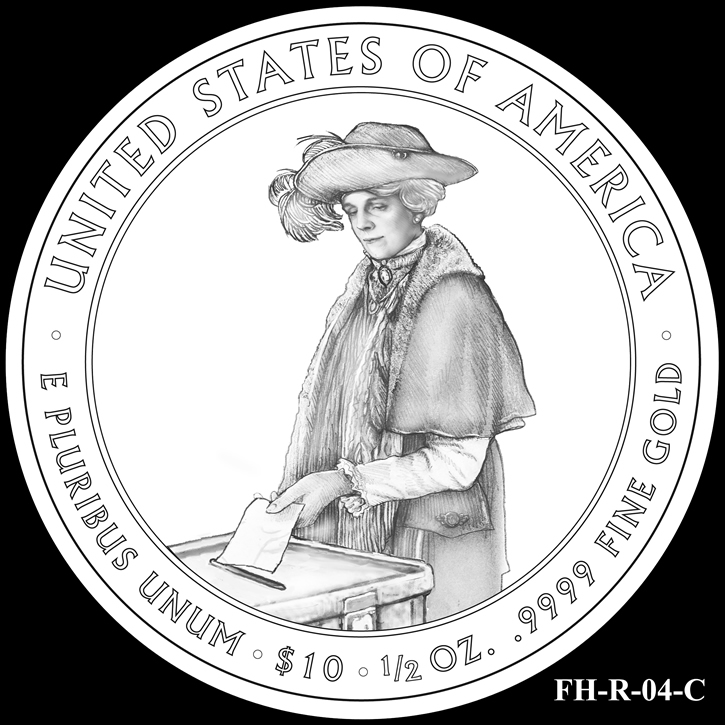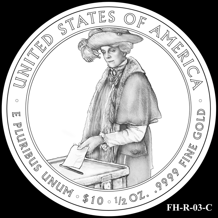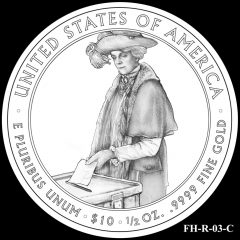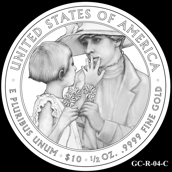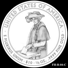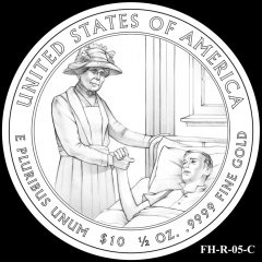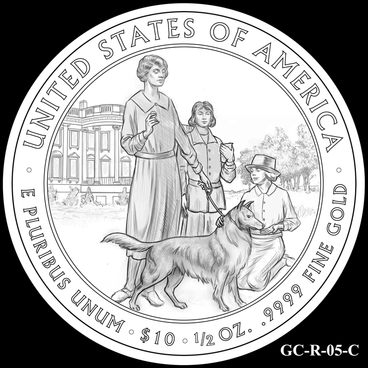 Reverse inscriptions are standard across all First Spouse releases and include UNITED STATES OF AMERICA, E PLURIBUS UNUM, $10 and 1/2 OZ. .9999 FINE GOLD. As for the design candidates for the Florence Harding reverse, there are six.