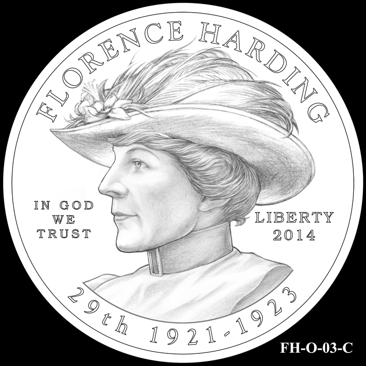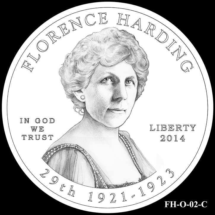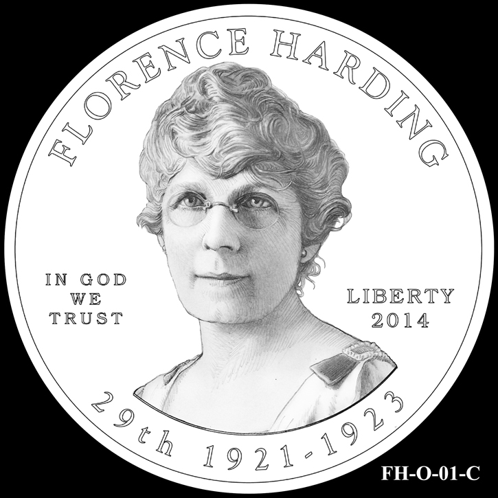 For Florence Harding, the U.S. Mint submitted three obverse portrait design candidates and six reverse images emblematic of her life. The obverse designs include the inscriptions of FLORENCE HARDING, IN GOD WE TRUST, LIBERTY, 2014, 29TH and 1921-1923.