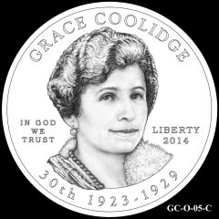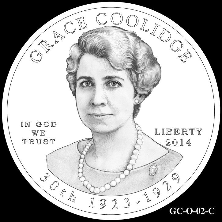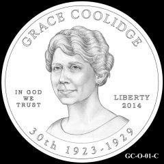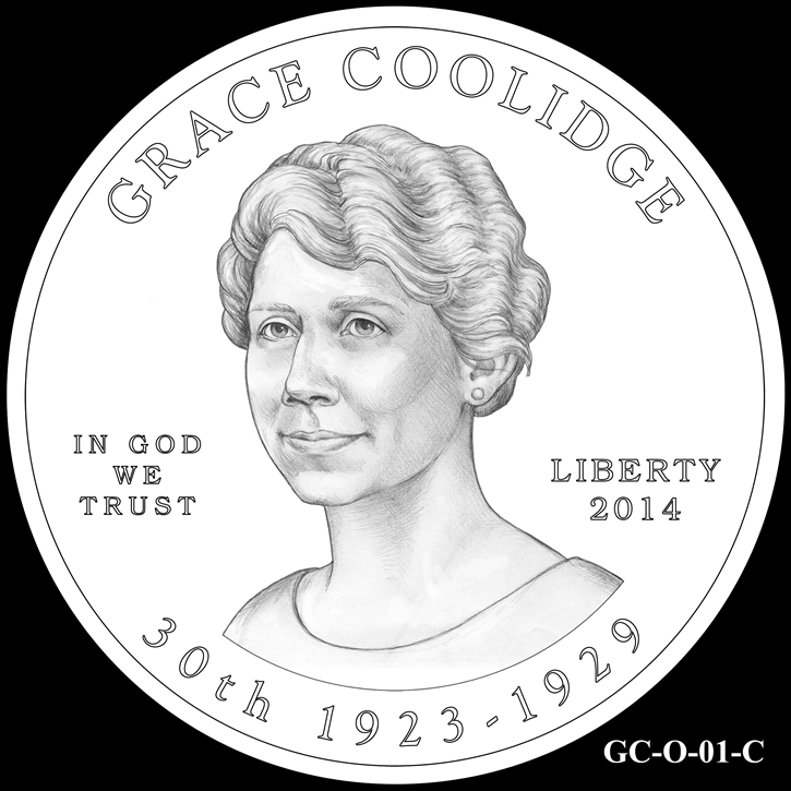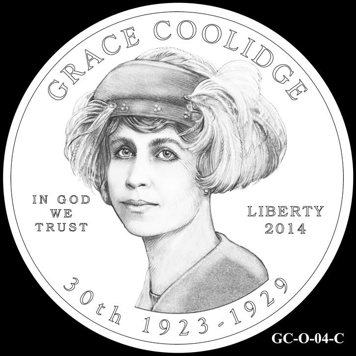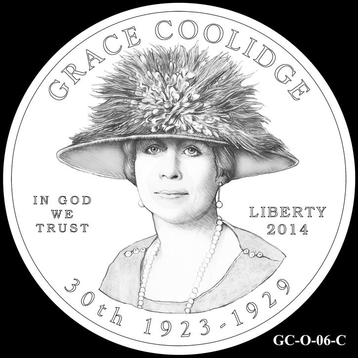 Six obverse design candidates were unveiled for the Grace Coolidge Gold Coins. Each will contain the inscriptions of GRACE COOLIDGE, IN GOD WE TRUST, LIBERTY, 2014, 30TH and 1923-1929.