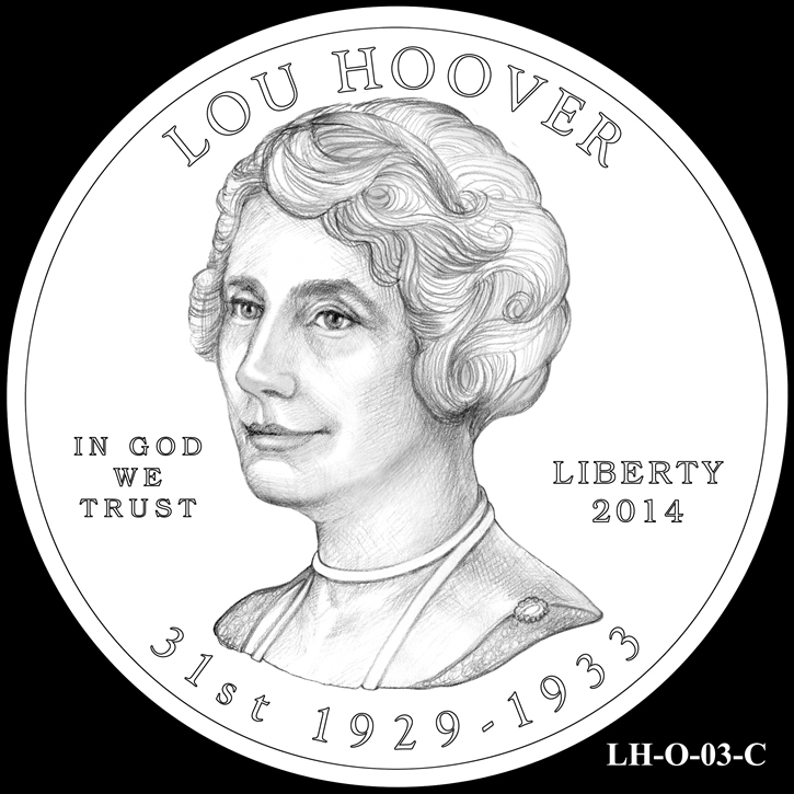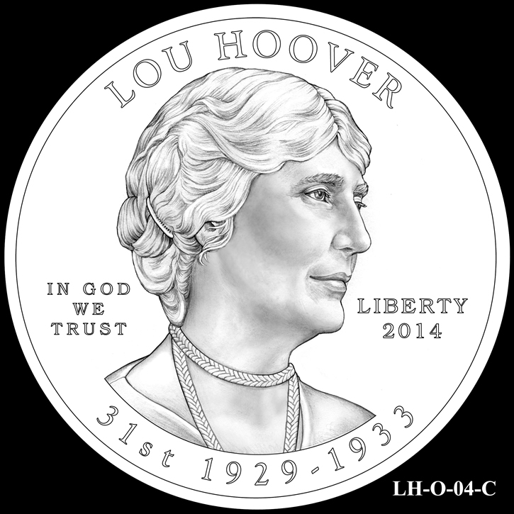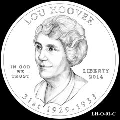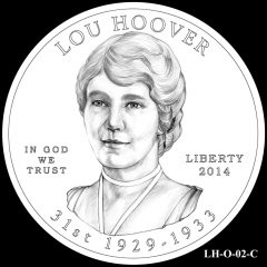 Four different design candidates were released for the Lou Hoover Gold Coins. These four images offer different perspectives of the former First Lady and include the inscriptions of LOU HOOVER, IN GOD WE TRUST, LIBERTY, 2014, 31ST and 1929-1933.