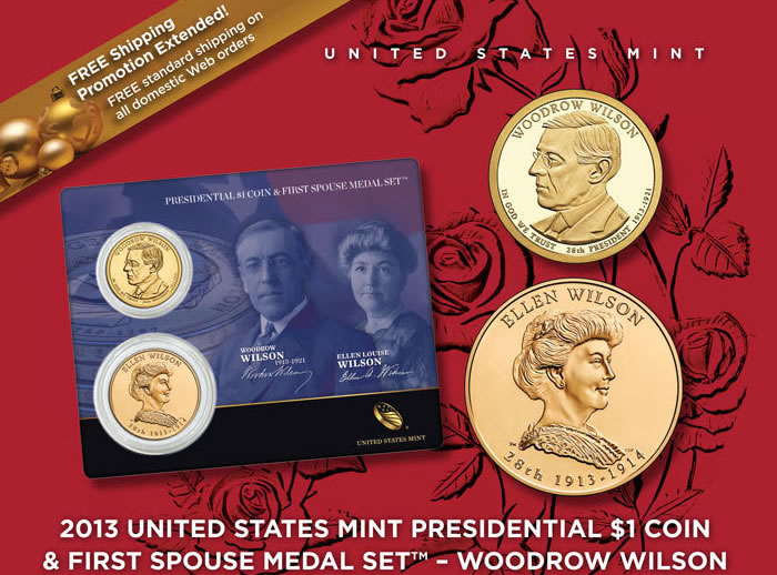 Earlier today, Dec. 10, 2013, sales kicked off for the fourth of five 2013-dated Presidential $1 Coin & First Spouse Medal Sets from the United States Mint. This one honors Woodrow Wilson and his first wife Ellen, the 28th President and First Lady of the United States.