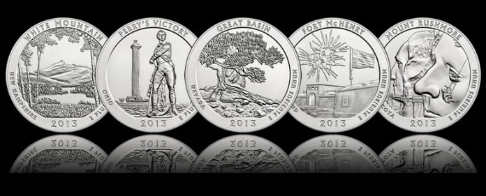 2013 America the Beautiful Five Ounce Silver Bullion Coins for investors have a brilliant finish and do not have a mint mark. The bullion coins were sold to the Mint’s network of authorized dealers. These dealers buy in bulk from the Mint and then resell the coins in smaller quantities for a bit over their melt value.