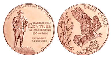 The Bald Eagle medal is also from times past, debuting in July 2003. It was the first of four designs celebrating the 100th anniversary of the National Wildlife Refuge System. These medals shared a common obverse portrait of Roosevelt, considered the father of the National Wildlife Refuge System. Reverses depicted the bald eagle, an elk, salmon and canvasback ducks.