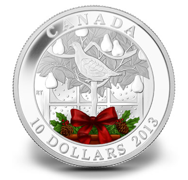 For CAD $64.95, the Partridge In A Pear Tree Silver Coin may be ordered. The reverse design by Canadian artist Risto Turunen was inspired by the classic holiday song "A Partridge in a Pear Tree." It shows an image of a single partridge in a pear tree with snowflakes falling behind a frosty window.