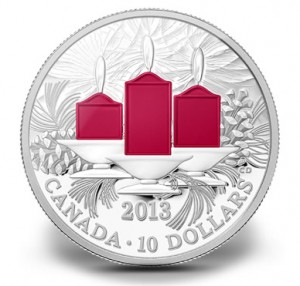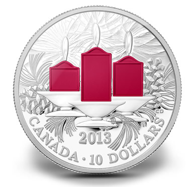 The Holiday Candles Fine Silver Coin is composed in one-half ounce of 99.99% pure silver. Canadian artist Claudio D’Angelo designed the reverse which includes a larger candle flanked by two smaller candles.