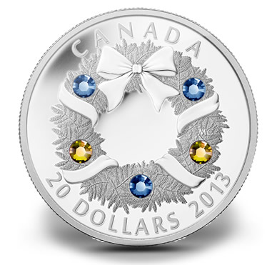 Unique enhancements were also added to the Holiday Wreath Fine Silver Coin currently available from the Royal Canadian Mint for CAD $114.95. In the case of this strike, five different Swarovski elements complement the reverse design by Canadian artist Maurice Gervais.