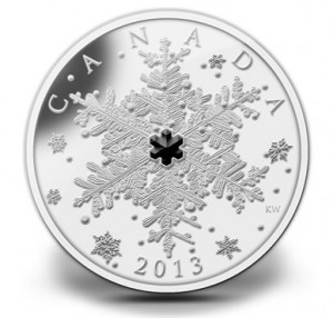 A single Swarovski element has been added to the reverse of the Winter Snowflake Fine Silver Coin. The element, featured in black, is snowflake shaped and appears at the center of a larger snowflake that was completed by Royal Canadian Mint engraver Konrad Wachelko.