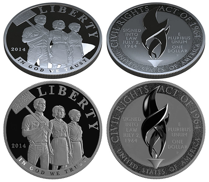 Designs for the 2014 Civil Rights Act of 1964 Silver Dollar were announced by the United States Mint on Thursday, Dec. 19, 2013. The coin celebrates the 50th anniversary of the enactment of the Civil Rights Act of 1964, with surcharges from their sales distributed to the United Negro College Fund (UNCF).