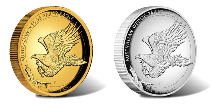 2014 Australian Wedge-Tailed Eagle Gold and Silver High Relief Coins are each struck to proof quality from either one ounce of 99.99% pure gold or 99.9% pure silver. These high relief coins feature a reverse design of a single Wedge-Tailed Eagle in flight.