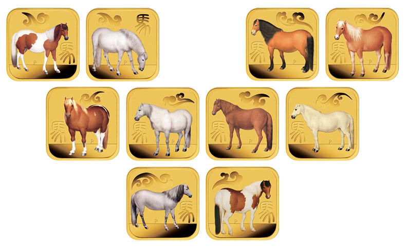 The 2014 Year of the Horse 1/10 oz Gold Square Ten-Coin Collection includes ten 1/10 ounce 99.99% pure gold coins each showcasing a different colored image of a horse. The Chinese character for horse also appears on the design.