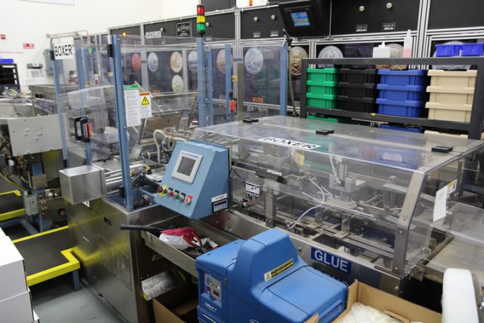 Finally, a fully automated boxing machine combines the Denver uncirculated coin sets in the red folders with the blue folders of the Philadelphia uncirculated coin sets. It’s quick and able to complete about of 2,100 sets per hour. The machine, not running during our visit, also boxes up the sets.