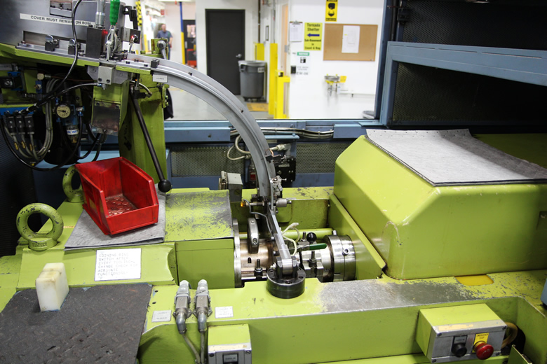 This bar feeder is attached to the CNC lathe shown directly below. Steel rods, like those shown above, are placed into the feeder. This Okuma Twin Star LT 200-M CNC Lathe accepts a long steel bar, cuts a piece from it and then gives the top end a cone-shape. Richard Diekemper checks the finish on the die blanks after they are polished in another machine Thielenhaus. Videos of Thielenhaus are in the original article.