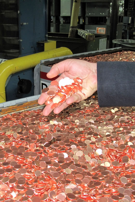 Finished Lincoln cents in catch box of Coining Press
