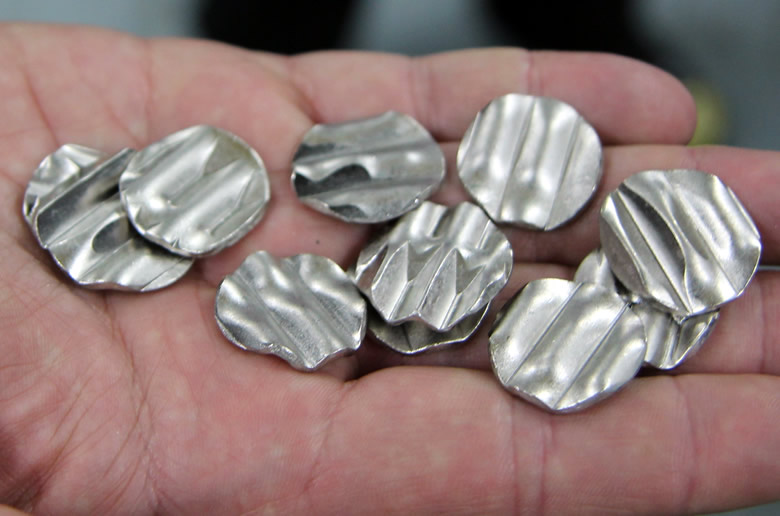 Schuler Upsetting Machine. This spinning disc quickly forces blanks against a stationary segment which causes the edge to slightly rise. Planchets created from blanks running through an upsetting mill. Notice these metal discs now have edges or rims.