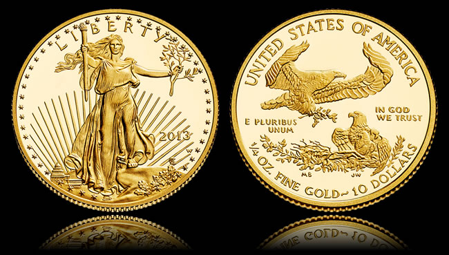 2013 Proof Gold Eagles are gone. On Tuesday, the one-half ounce, or $25-denominated coin, sold out and earlier today it was joined by the one-quarter ounce, or $10-denominated coin. They are both poised at mintage lows. Since the latest batch of U.S. Mint sales figures are current only through to Sunday, however, buyers of the two Gold Eagles must wait until next week’s sales report to learn if the mintages stay below the current lows of the 2012 Gold Eagles. Yesterday’s article about the sellout of the $25 Gold Eagle includes a table for comparisons.