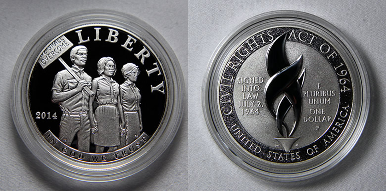 Out of the gate sales were a bit sluggish but the two coins have maintained a decent pace since with each always among the Mint’s top five weekly sellers. Most recent figures have the 2014-P Proof Civil Rights Act of 1964 Silver Dollar with sales of 33,855 and the 2014-P Uncirculated Civil Rights Act of 1964 Silver Dollar with sales of 13,681 for a combined total of 47,536. That’s about 14% of the 350,000 mintage allowed under the authorizing law.