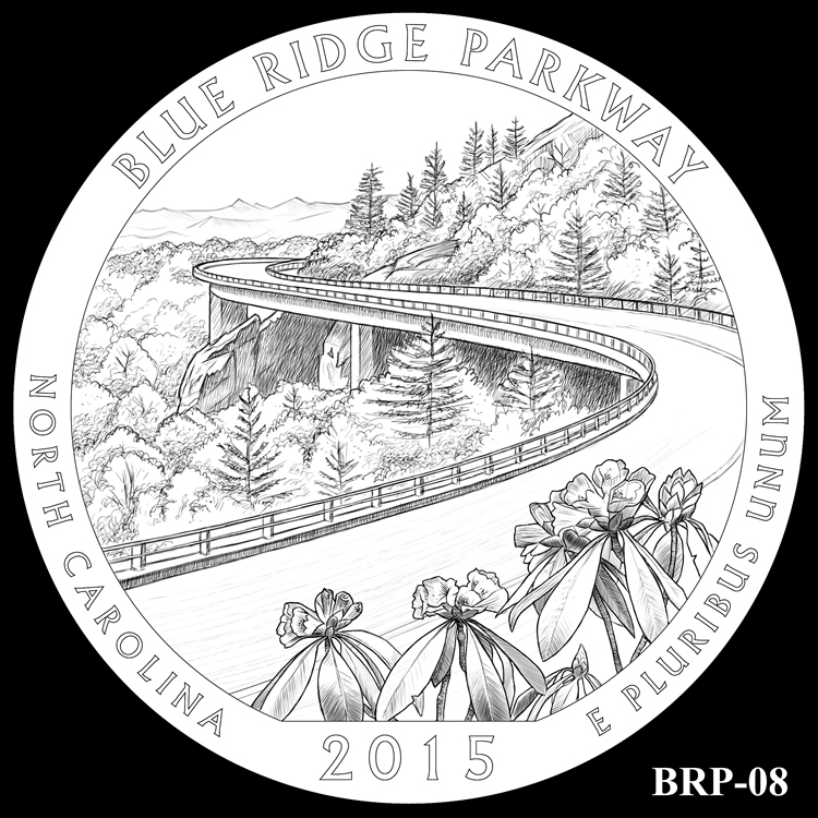 Design 7 depicts the grace and curvature of the road hugging the side of a mountain and includes the extraordinary stonework that typifies so much of the Parkway’s tunnel facings and bridges. Again, the Virginia and North Carolina state tree and flower are in the foreground.