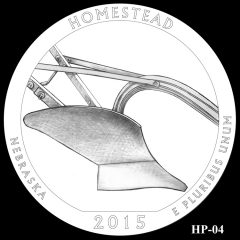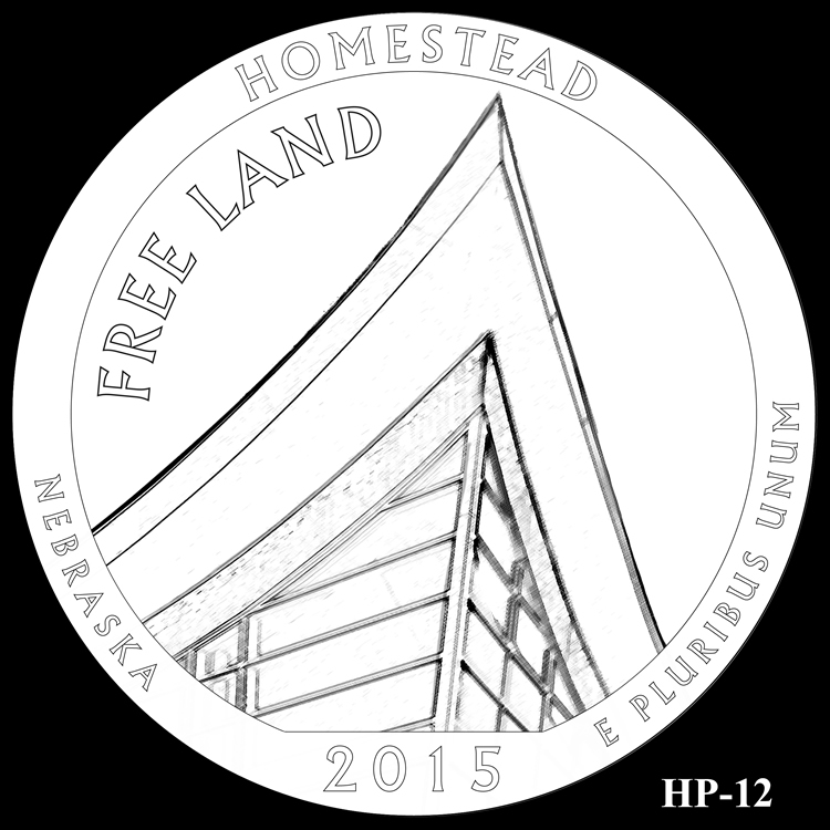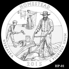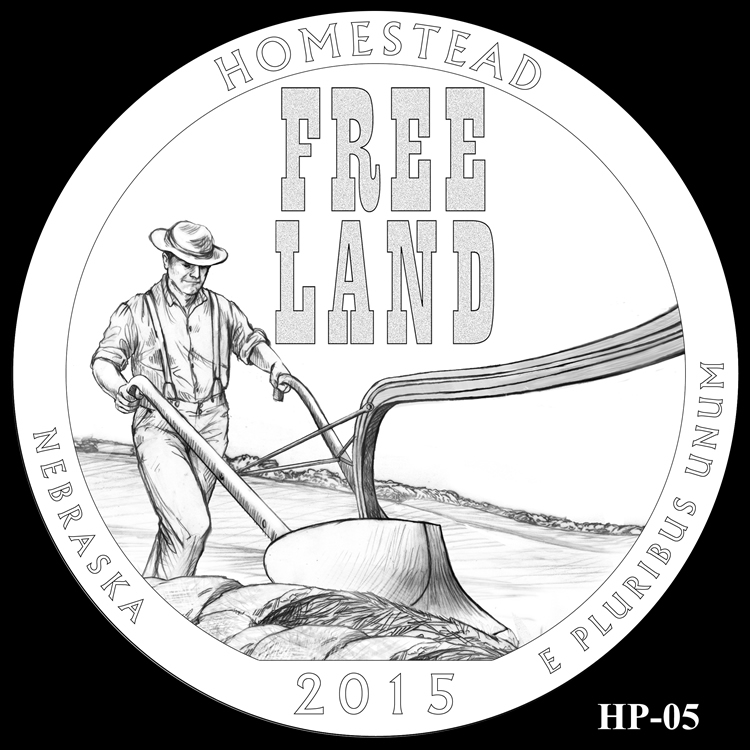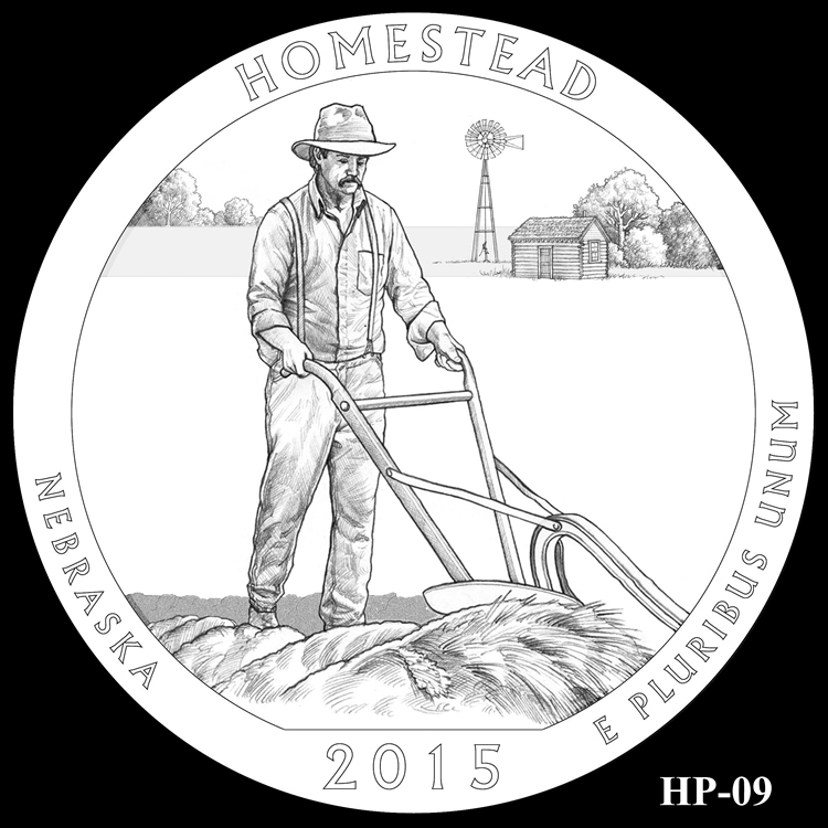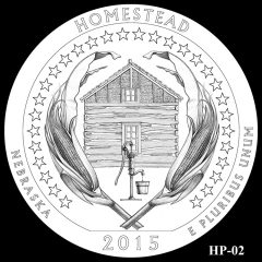 Design 2 represents three fundamentals to survival common to all homesteaders: food, shelter and water. The 30 stars symbolize the 30 states that participated in the Homestead Act.