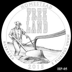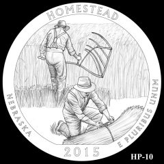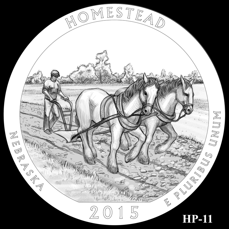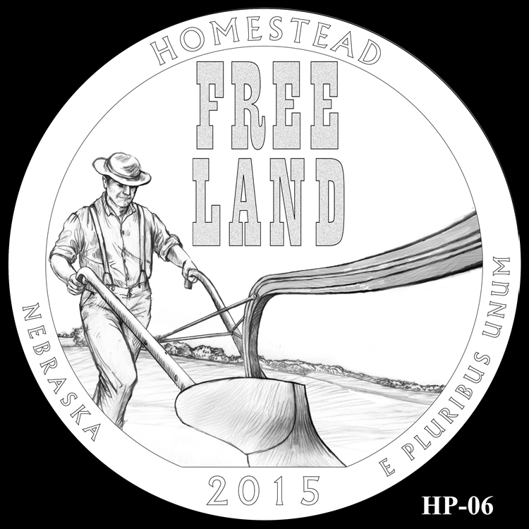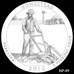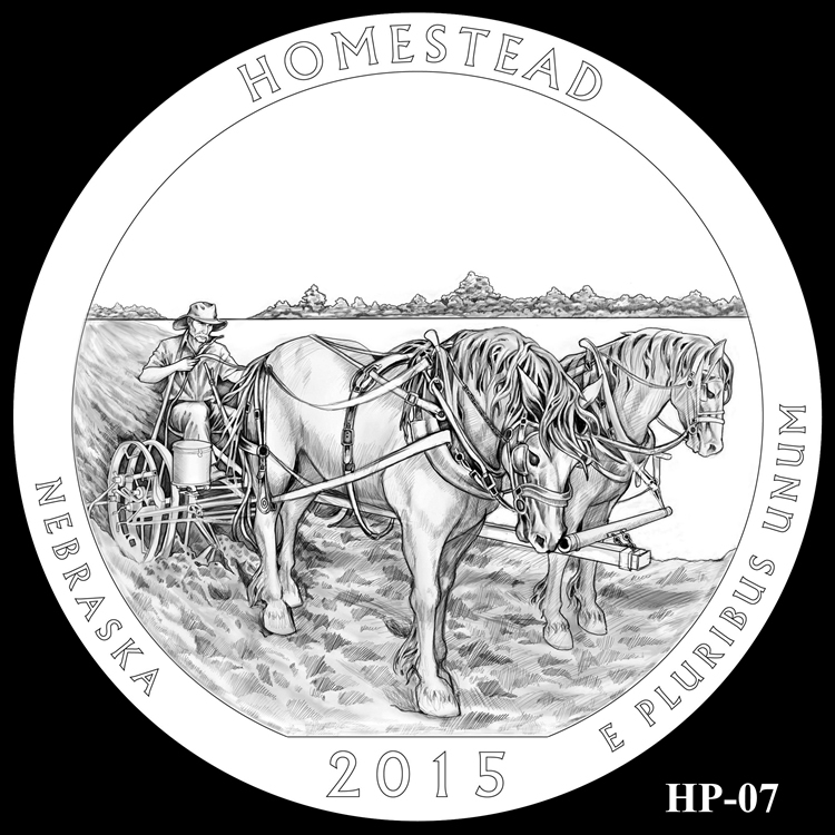 Design 7 shows a homesteader with his team of horses plowing the field.