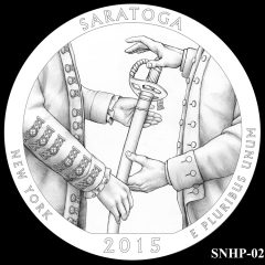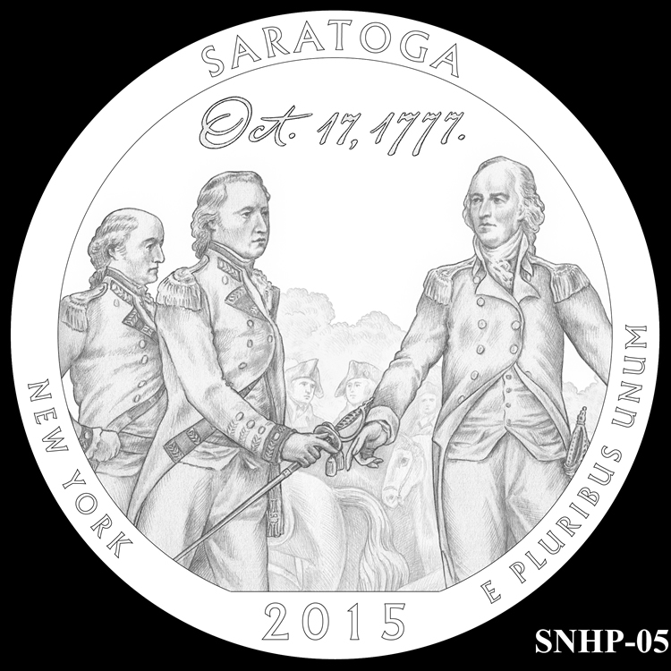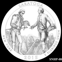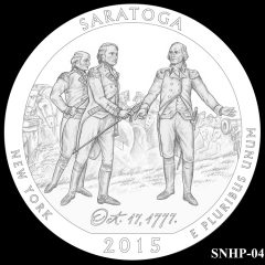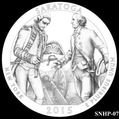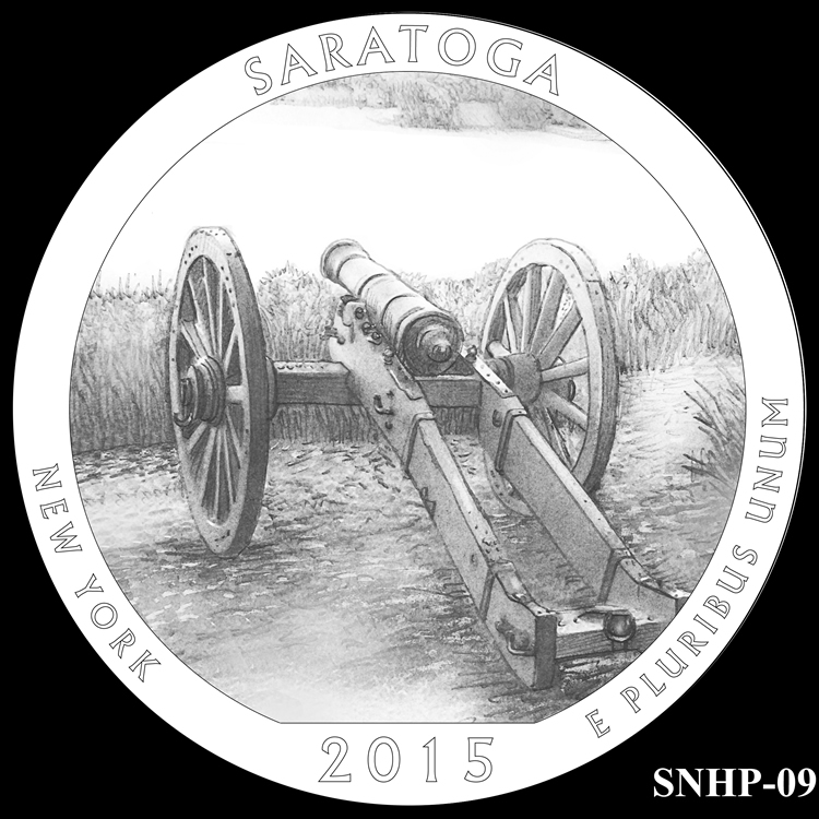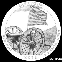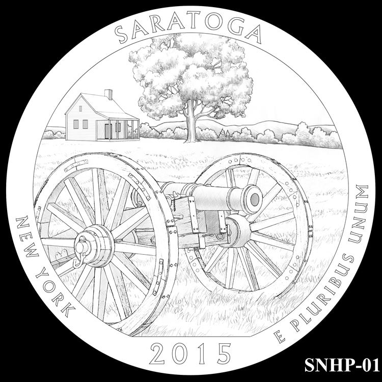 Design 1 features a Revolutionary War cannon in the foreground. A farmhouse, used as one of the American Army’s headquarters during the Battle of Saratoga, is seen in the background.