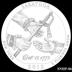 Design 6 is another close-up of the sword surrender and includes the inscription, "Oct. 17, 1777."