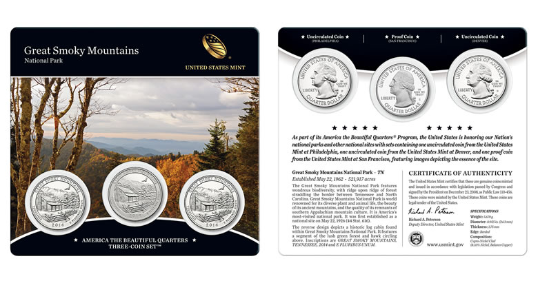 Its sales started today, Feb. 11, 2014, at noon ET. For $9.95, the Three-Coin Set contains three quarters of different origins, all depicting an image emblematic of the most visited national park in the U.S., located in Tennessee. Included are: