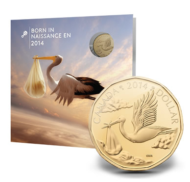 The 2014 Baby Gift Set is offered as a distinguished option for the newborns of the year and their families. Design by Three Degrees Creative, shown on the reverse of the specially struck $1 coin is a stork in flight with a precious bundle hanging from its beak.