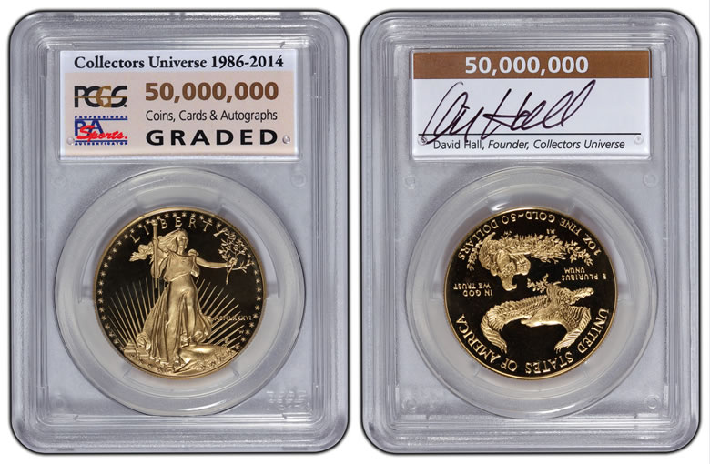 To celebrate, Collectors Universe awarded the submitter a PCGS-certified one-ounce 1986-W Proof American Gold Eagle, which was encapsulated with a special 50,000,000 insert label that Collectors Universe President and Founder David Hall autographed.