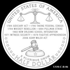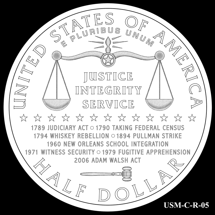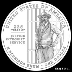 As for the reverse, Congress dictated that it be an image consistent with the role that the United States Marshals played in a changing nation. Suggested themes included the Whiskey Rebellion and the rule of law; slavery and the legacy of inequality; and the struggle between labor and capital.