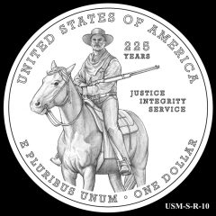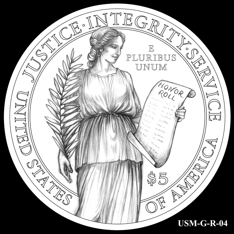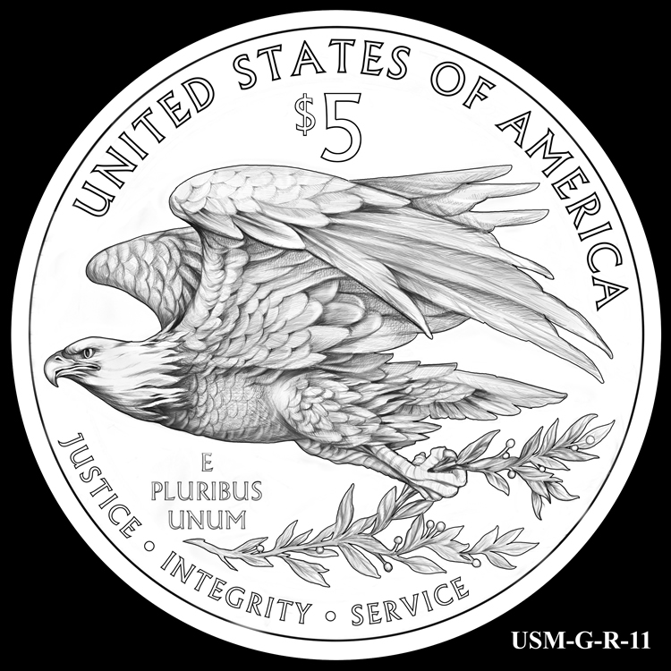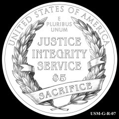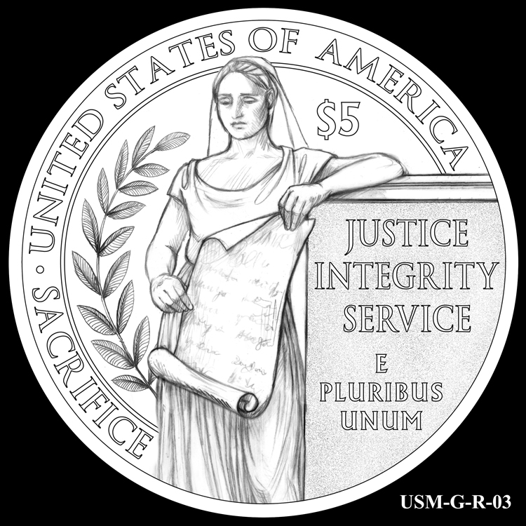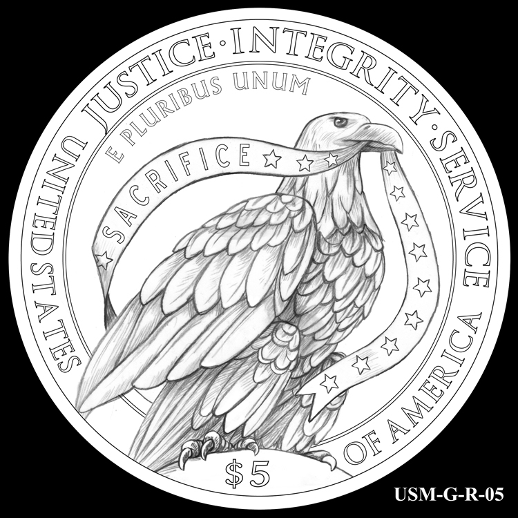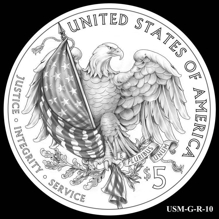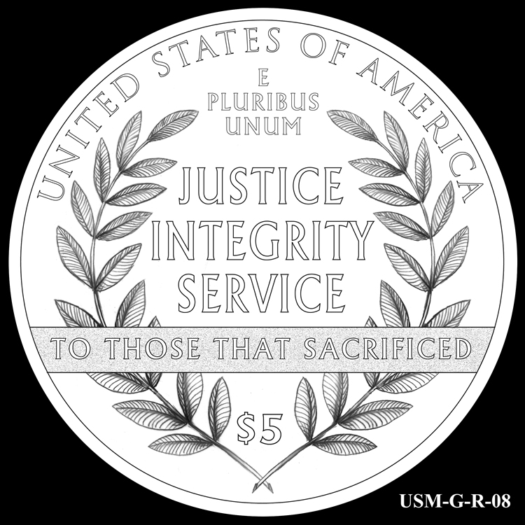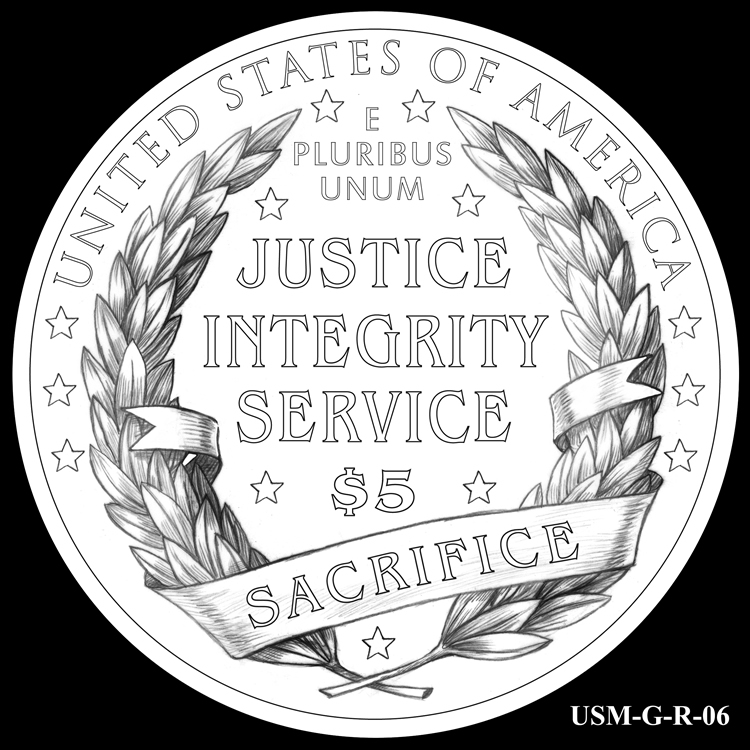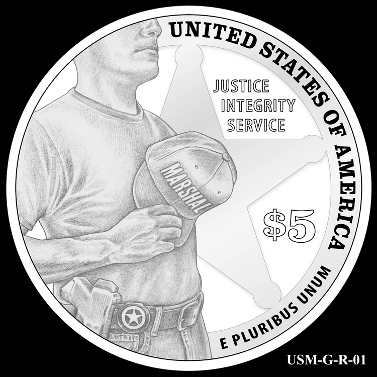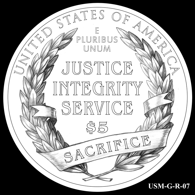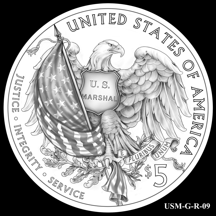For the reverse of the gold coins, a design emblematic of the sacrifice and service of the men and women of the United States Marshals Service is required. In addition, the Marshals Service motto ‘Justice, Integrity, Service’ is to appear.