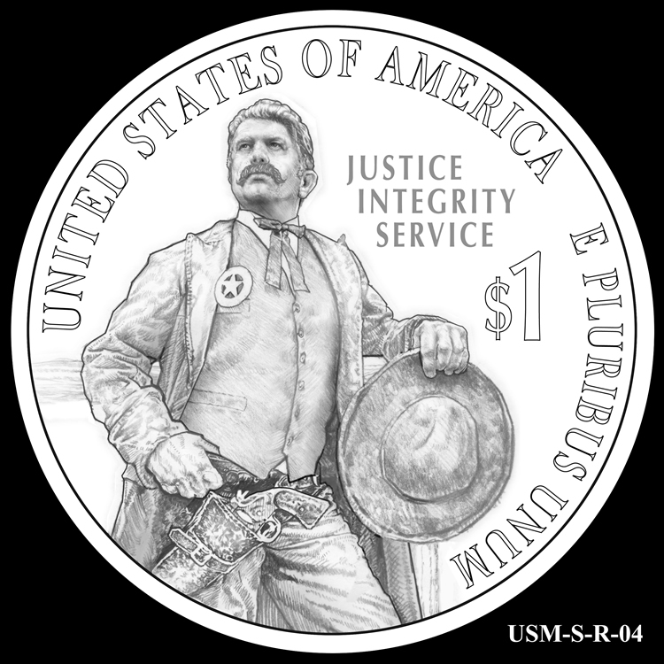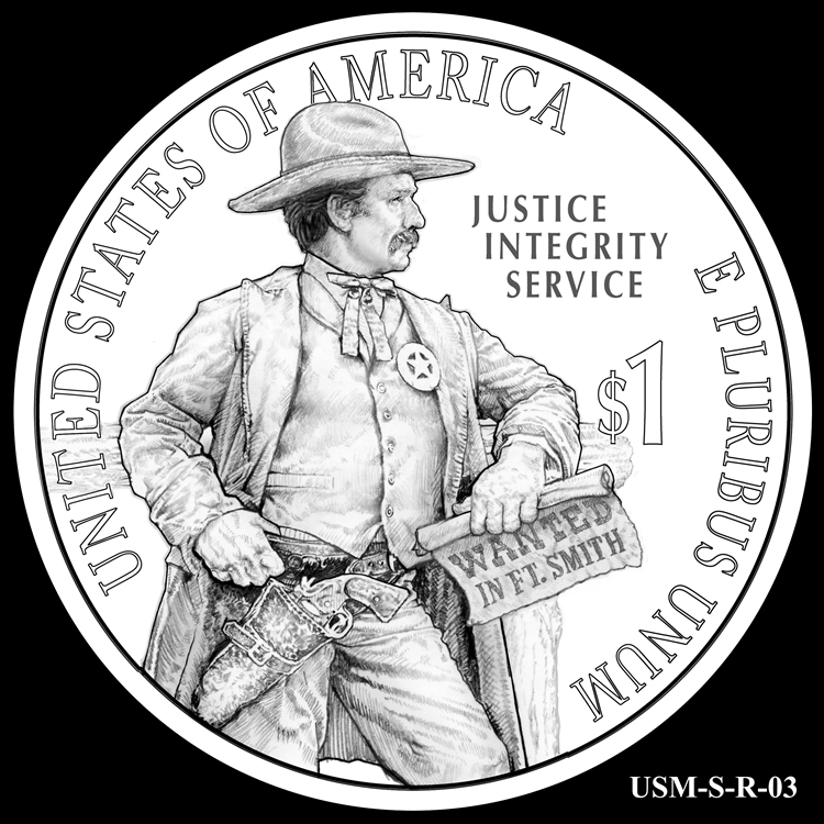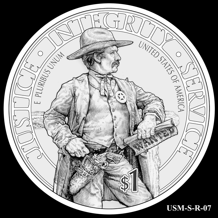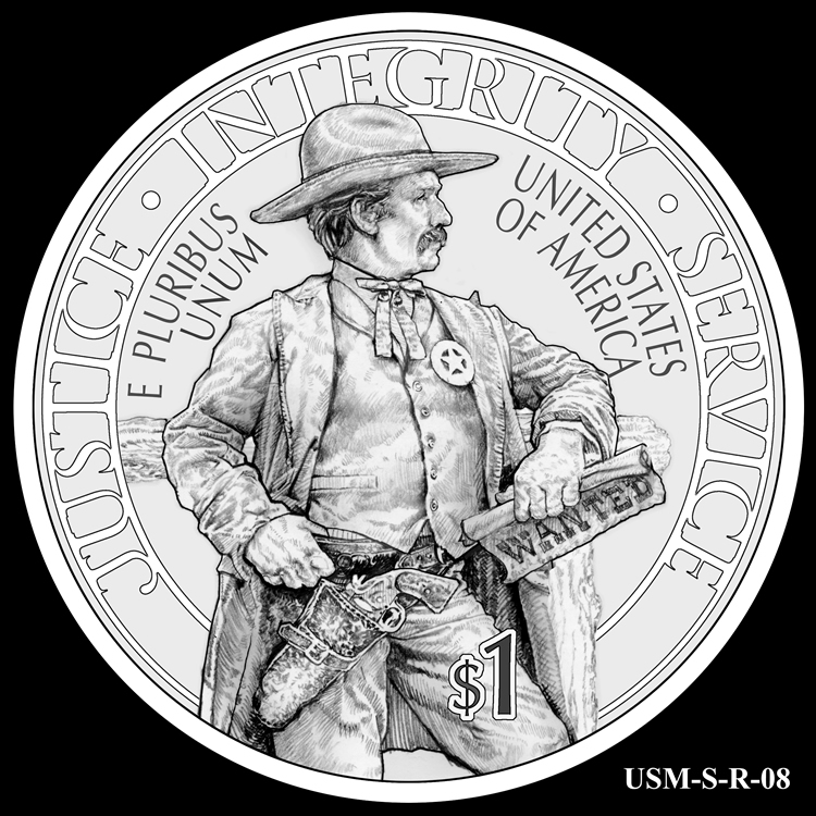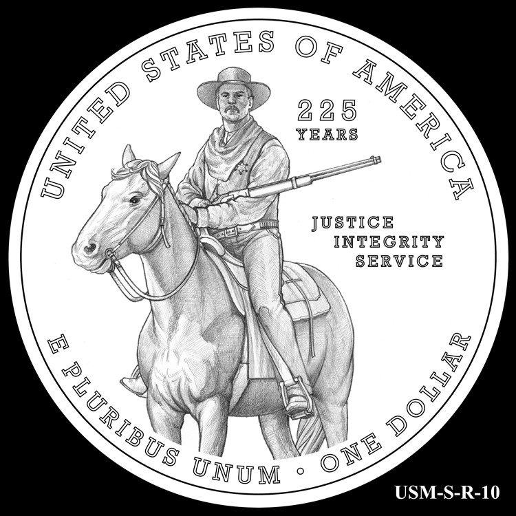 The silver dollar reverse image is to be emblematic of the United States Marshals legendary status in America’s cultural landscape including frontier lawmen and the Marshals Service motto ‘Justice, Integrity, Service’.