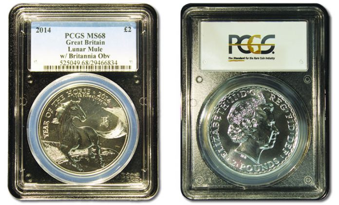 Varieties of bullion 2014 £2 Britannia and 2014 £2 Lunar Year of the Horse mule error coins have been authenticated, graded and certified by the Paris Submission Center of Professional Coin Grading Service (www.pcgseurope.com).