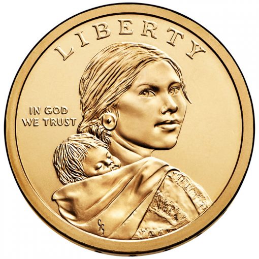 Obverses are common to Native American $1 Coins. They feature Glenda Goodacre’s image of Sacagawea, the Shoshone woman who was an interpreter and guide for the Lewis and Clark Expedition, and her baby. Inscriptions above the two read: LIBERTY and IN GOD WE TRUST.