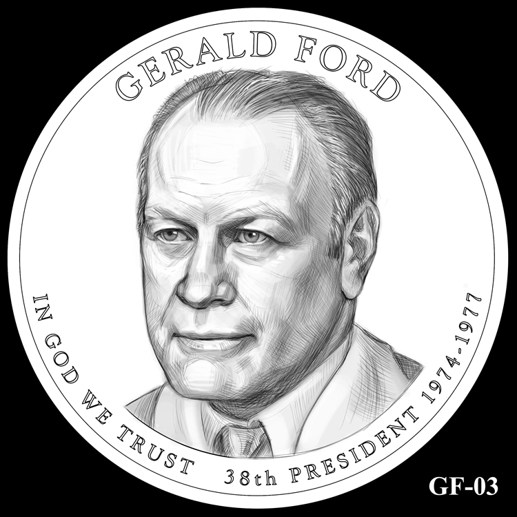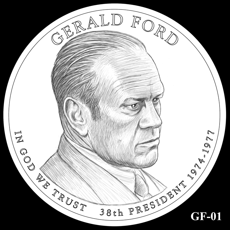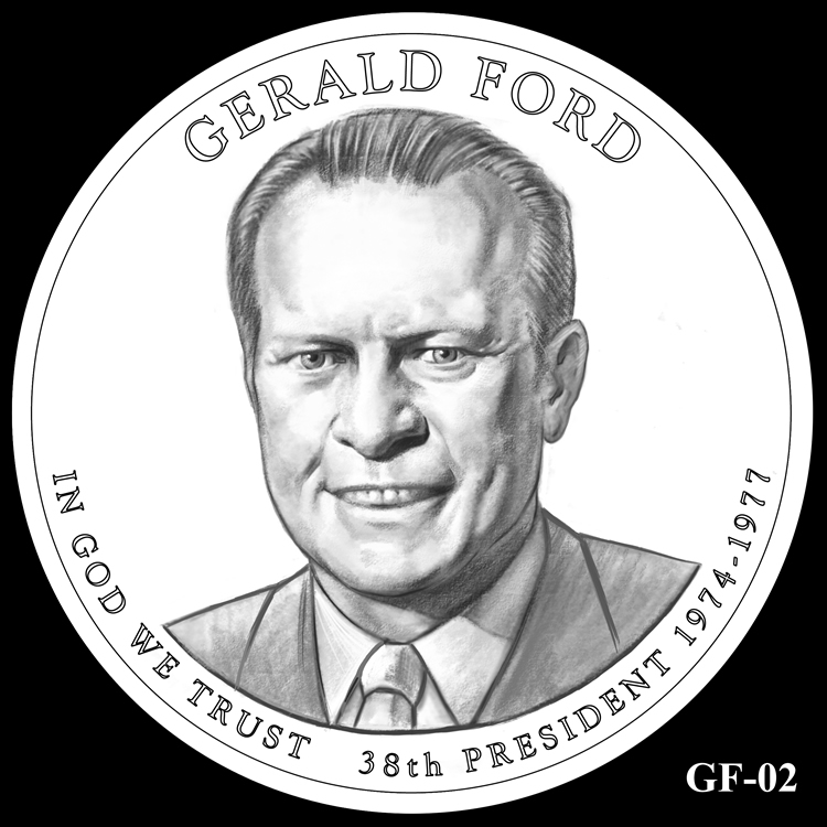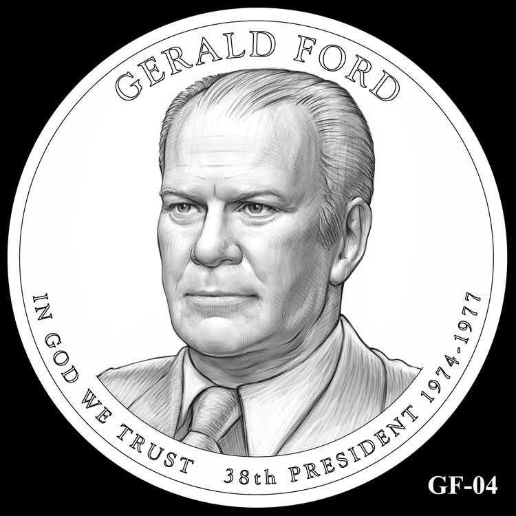There are also four proposed designs for the 2016 Gerald Ford Presidential $1 Coin. Inscriptions on each include, "GERALD FORD," "IN GOD WE TRUST," "38TH PRESIDENT" and "1974-1977."