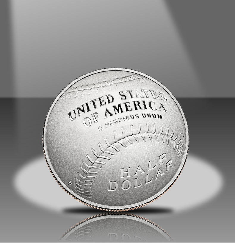 Gracing the reverse or tails side of each coin is Don Everhart’s depiction of a baseball. Reverses are convex in shape, and include inscriptions of UNITED STATES OF AMERICA, E PLURIBUS UNUM and either FIVE DOLLARS, ONE DOLLAR or HALF DOLLAR.
