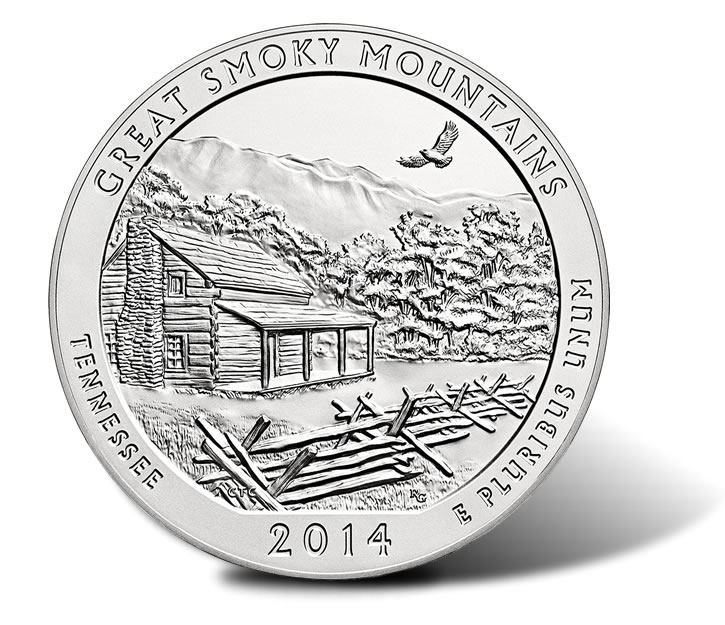 New from the United States Mint is the 2014-P Great Smoky Mountains National Park Five Ounce Silver Uncirculated Coin, the first release this year and the 21st overall from the series of America the Beautiful Five Ounce Silver Uncirculated Coins.
