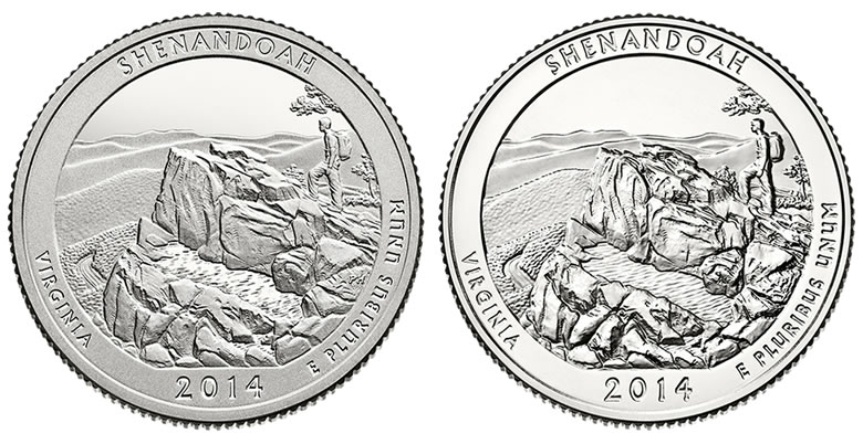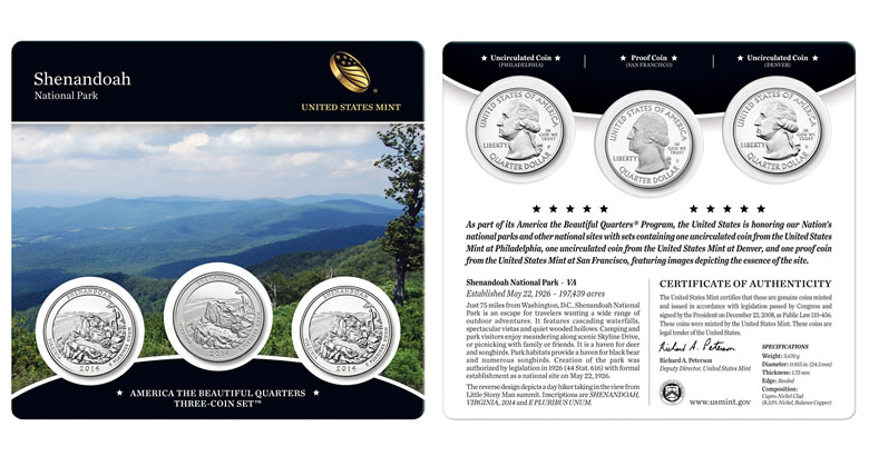 This latest America the Beautiful Quarter Three-Coin Set is the second one this year and the 22nd in the series. Coins within it honor the park in Virginia, about an hour drive from Washington, D.C. Shenandoah quarters entered circulation beginning on March 31, 2014 with an official launch ceremony this past Friday.