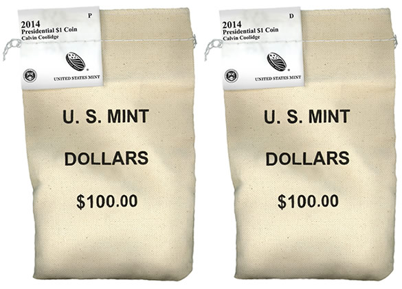 These bags are made of canvas and have written on them, "U.S. Mint," "Dollars" and "$100.00." There is a tag sewn onto the top left corner of each bag. The printing on the tag is more specific to the product and reads, "2014," "Presidential $1 Coin," "Calvin Coolidge," "United States Mint" and either "P" or "D" for the city of origin. The U.S. Mint logo is also on the tag.