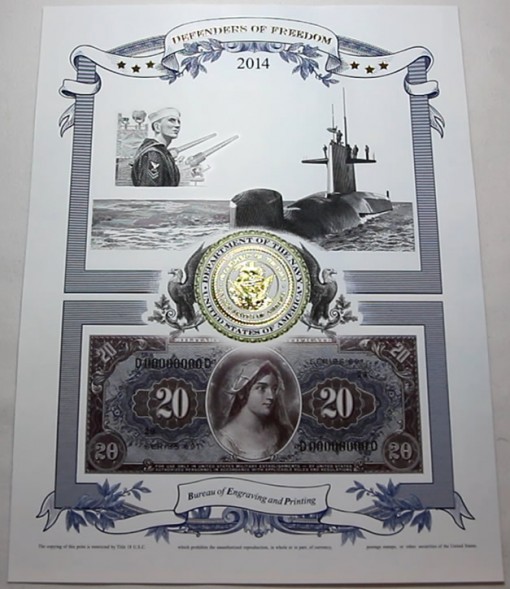 Officially called the 2014 Intaglio Print Defenders of Freedom Navy, each print measure 8 1/2" x 11" and is $22.50. The latest print features three major decorative designs: