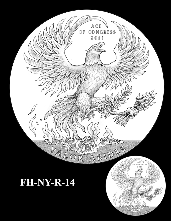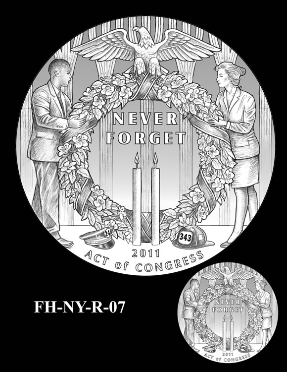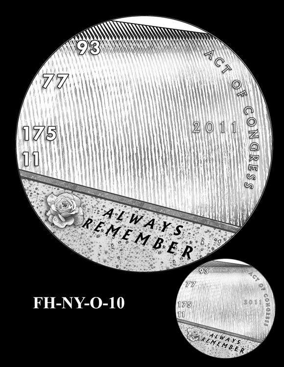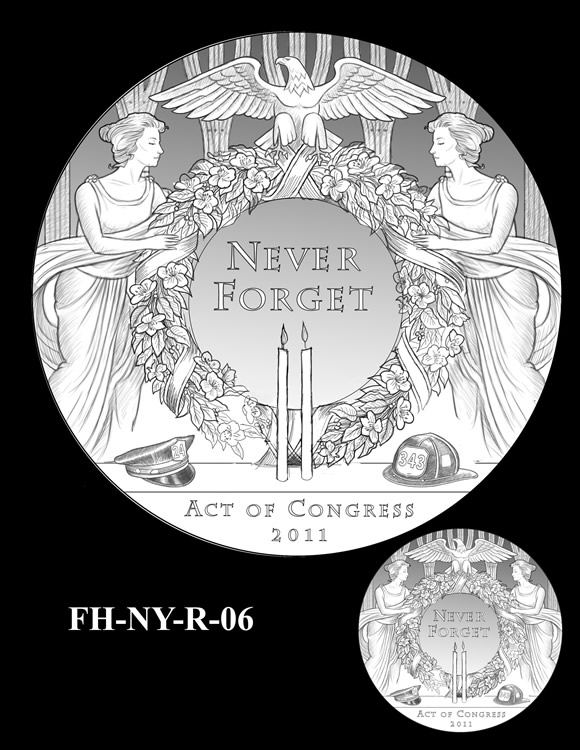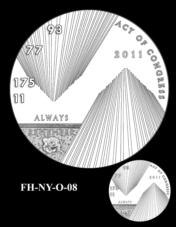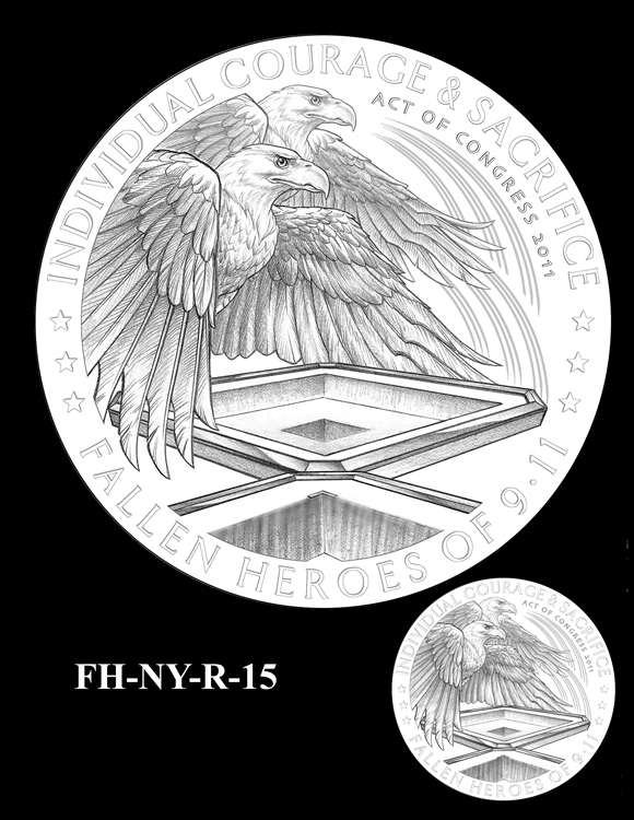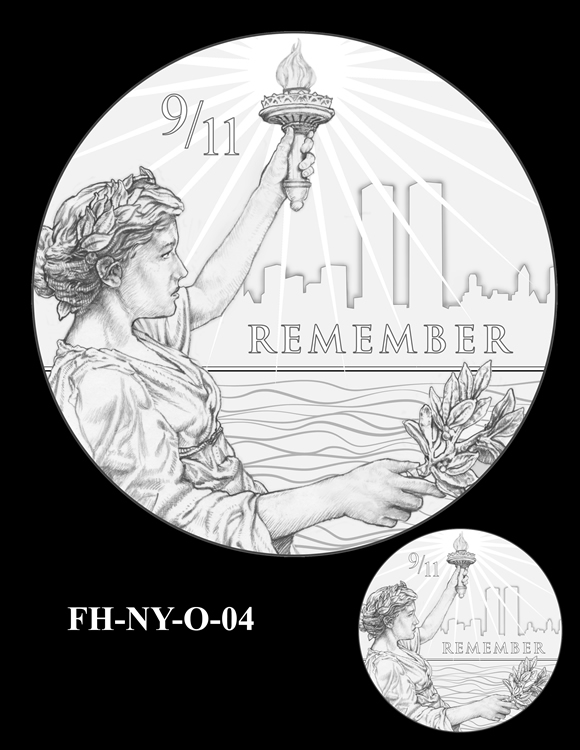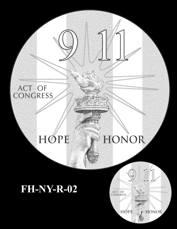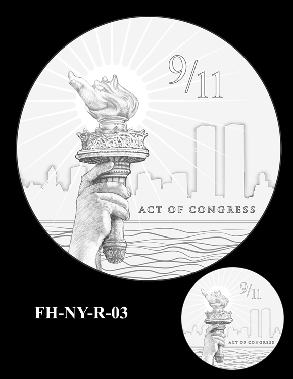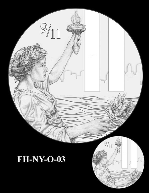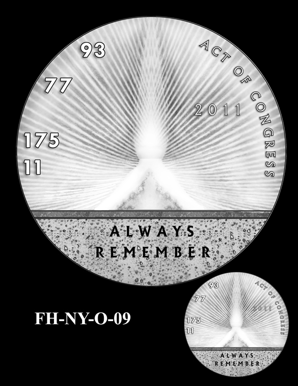 Offered below are images of the different design candidates for the Fallen Heroes of 9/11 Congressional Gold Medals. They are separated by the theme each conveys. (Jump to New York designs, Flight 93 designs, or Pentagon designs.)