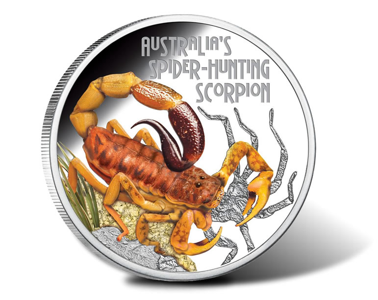 New this month from the Perth Mint of Australia is a proof silver coin depicting an Australian Spider-Hunting Scorpion.