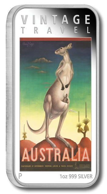 A new series depicting vintage Australian travel posters debuts with the 2014 Kangaroo 1 oz Silver Proof Rectangle Coin. Offered on the reverse of the coin is a colored recreation of a vintage Australian travel poster from the 1950’s which shows a kangaroo in the outback.