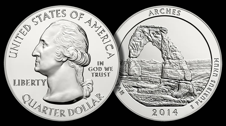 Today marks the debut of the 2014 Arches National Park Five Ounce Silver Bullion Coin from the Mint’s America the Beautiful series. First-day sales reached 5,500 coins. The U.S. Mint sell these 99.9% fine silver coins to a network of distributors at a price of $9.75 per coin, plus spot. Precious metals and coin dealers are now accepting pre-orders from the public.