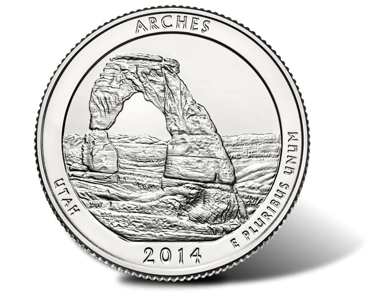 Found on the reverse of Arches National Park Quarters is Donna Weaver’s depiction of Delicate Arch with the La Sal Mountains in the background.