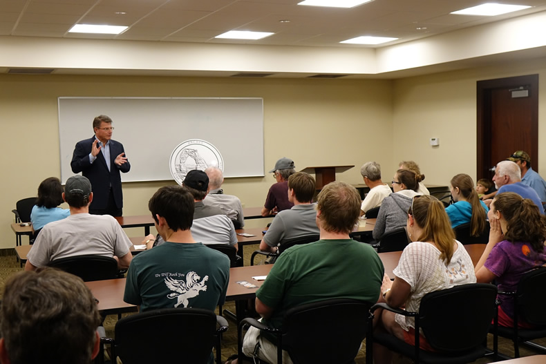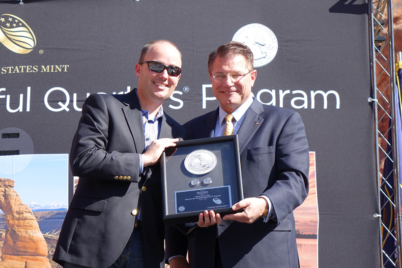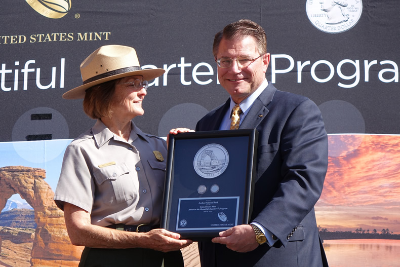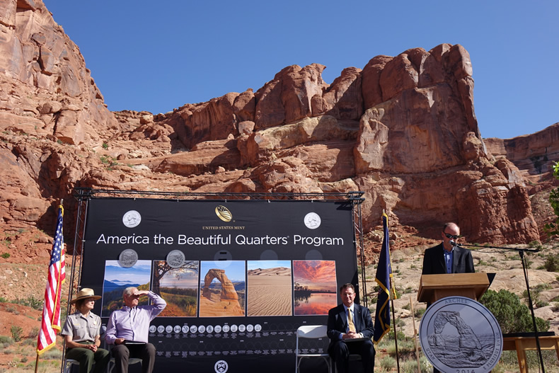 Friday’s event took place at Arches National Park Visitor Center. Speakers included Utah Lieutenant Governor Spencer J. Cox, Arches National Park Superintendent Kate Cannon, and United States Mint Deputy Director Richard A. Peterson. Moab’s Mayor Dave Sakrison served as master of ceremonies.