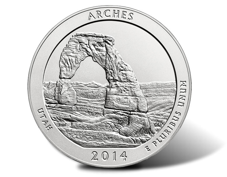 New from the United States Mint is the 2014-P Arches silver coin, the third release this year and the 23rd overall from the series of America the Beautiful Five Ounce Silver Uncirculated Coins.