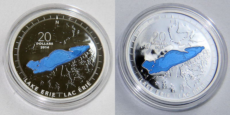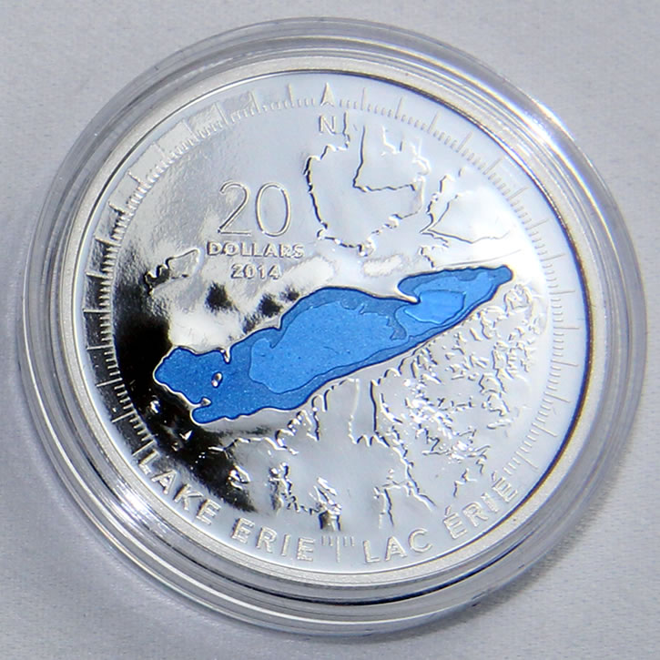 Contrasting against the bathymetry map of the lake is the coin’s raised elements representing the surrounding land area. Translucent blue colored enamel draws attention to the water and its depth. Inscriptions around the scene include 2014, the legal tender face value of 20 DOLLARS, LAKE ERIE and the French name of the lake, LAC ERIE.